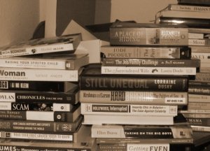 In perusing my bedroom shelves, here is what I found out about my own loosely organized books. Heavier books are on the bottom shelf, consisting mostly of photo albums with a few coffee table and craft books thrown in there. Next up is a shelf of children’s books – current