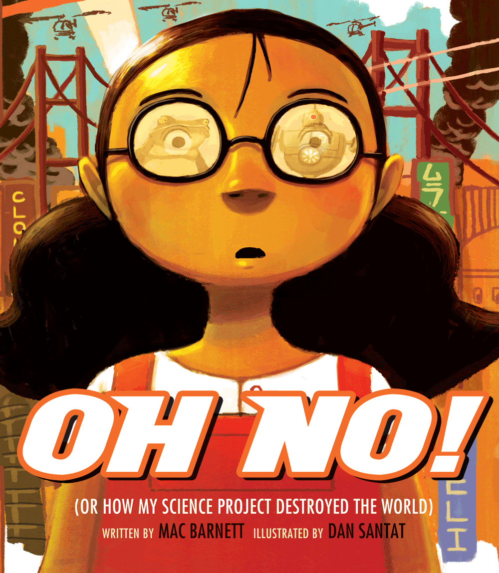 This one is just a silly hot mess. A girl creates a robot for a science project. She wins, of course, but then it starts destroying the world! So, she scientifically enhances a Toad to take it out. Really, a toad? He’s better at being a hero than you might think. But just when the world’s safe again, it’s the toad’s turn to run amok. This book is very funny, and the illustrator is doing some interesting shout-outs to a Godzilla-like Japanese influence. Different, fun, & graphically interesting.